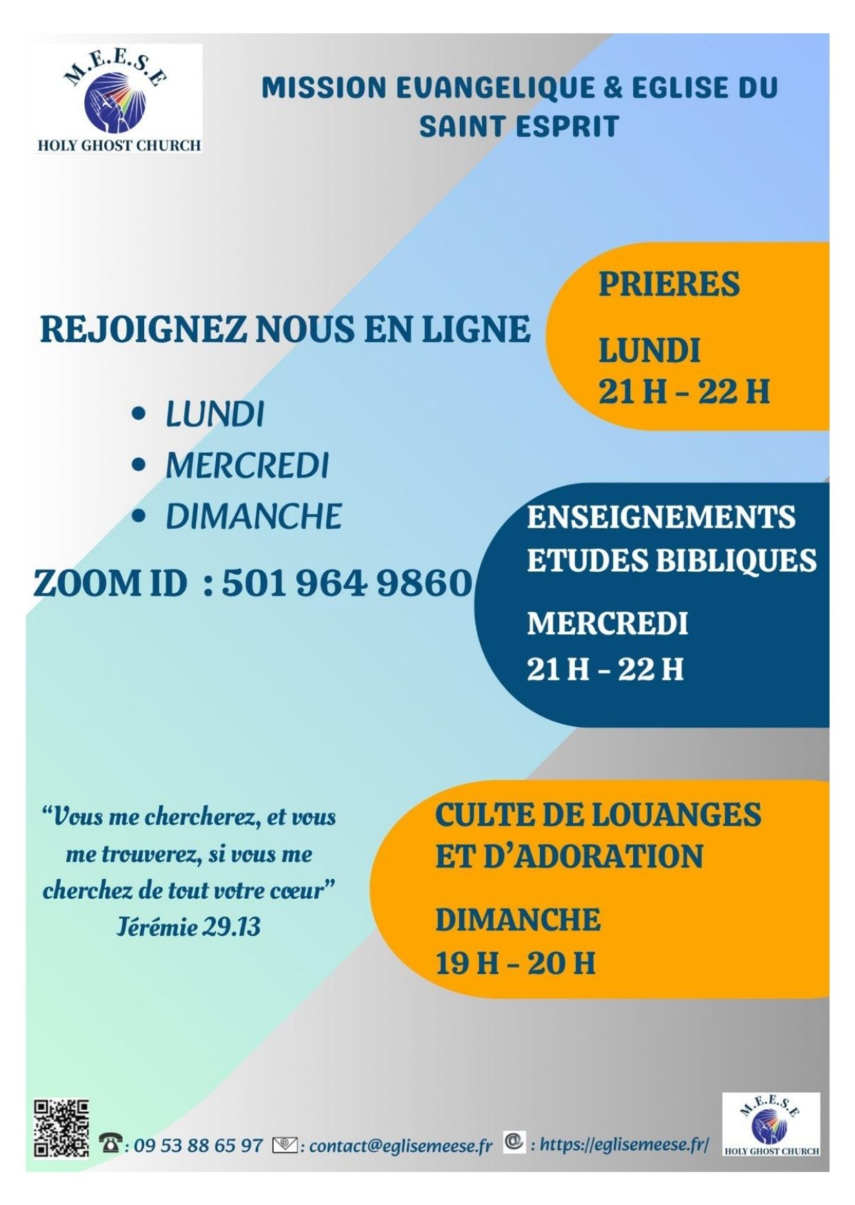 Chaque mercredi de 21H à 22, participez à nos sessions d'études bibliques pour approfondir votre compréhension des Écritures. Un lien Zoom est disponible pour ces moments d'édifications.